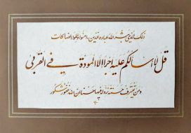 بگو: من هیچ پاداشی از شما بر رسالتم درخواست نمیکنم جز دوست داشتن نزدیکانم [اهل بیتم] و هر کس کار نیکی انجام دهد، بر نیکی اش میافزاییم؛ چرا که خداوند آمرزنده و قدردان است.