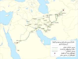 در مسیر حرکت علی بن موسی الرضا از مدینه تا مرو، اختلافاتی وجود دارد؛ منابع سفر را از مدینه تا فارس گزارش کردهاند اما در اینکه پس از فارس، کاروان از چه مسیری به سمت مرو در حرکت شد، دچار اختلافند.[۱۶][۱۷] بیشتر منابع از بصره، اهواز و فارس به عنوان مسیر حرکت یاد کردهاند.[۱۸] برخی همچون بلاغی در تاریخ نائین مسیر حرکت وی را «مدینه، بصره، ارجان، فارس، اصفهان، نیشابور، دهسرخ، سناباد، سرخس و مرو» میدانند[۱۹][۲۰] و برخی چون اعتمادالسلطنه، مسیر حرکتی از «مدینه، بصره، اهواز، فارس، اصفهان، قم، ری، سمنان، دامغان، نیشابور، طوس، سرخس و مرو» ترسیم نمودهاند. در مقابل مشهورترین قول در مسیر حرکت علی بن موسی «مدینه، مکه، قادسیه، بصره، اهواز، بهبهان، اصطخر فارس، طبس، نیشابور و مرو» گزارش شده است.[۲۱][۲۲][۲۳] جعفریان در کتاب اطلس شیعه، مشهورترین مسیر حرکت علی بن موسی به مرو را «مدینه، نقره، هوسجه، نباج، حفر ابوموسی، بصره، اهواز، بهبهان، اصطخر، ابرقوه، ده شیر (فراشاه)، یزد، خرانق، رباط پشت بام، نیشابور، قدمگاه، دهسرخ، طوس، سرخس، مرو» میداند.[۲۴] مادلونگ معتقد است که عبور کاروان علی بن موسی الرضا از بغداد و کوفه نامحتمل است چراکه بغداد و کوفه در آن زمان در دست شورشیان بود؛ بنابراین، گفتهٔ یعقوبی که رجاء به بغداد و نَهاوَند سفر کرده، مردود است.[۲۵] با این وجود بیهقی گزارشی در خصوص استقبال و بیعت طاهر بن حسین — فاتح بغداد — در اقامت چند روزه علی بن موسی الرضا در بغداد را آورده است.[۲۶] مسیر دیگری که برای علی بن موسی الرضا گزارش شده است «مدینه، مکه، نباج، بصره، اهواز، اربق (اربک)، ارجان (بهبهان)، ابرکوه (ابرقوه)، ده شیر (فراشاه)، یزد، قدمگاه خرانق (مشهدک)، رباط پشتبادام، نیشابور، قدمگاه نیشابور، دهسرخ، طوس، سرخس و مرو» است.[۲۷] مسیری که برای سفر علی بن موسی الرضا از فارس به نیشابور گزارش شده است، فارس را از طریق کرمان و استان قهستان، به نیشابور وصل میکرد. این مسیر از اهمیت تجاری بالایی برخوردار بود و بارانداز نیشابور را که کالاهای مناطق مختلفی را شامل میشد، به مناطق جنوبی و سواحل خلیج فارس وصل میکرد.[۲۸] کاروانیان در این سفر از چهار کشور کنونی ایران، عربستان، عراق و ترکمنستان گذشتهاند.[۲۹]
