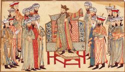 نگاره‌ای از کتاب جامع‌التواریخ با نقش سلطان محمود غزنوی هنگام دریافت خلعت از خلیفه القادر بالله