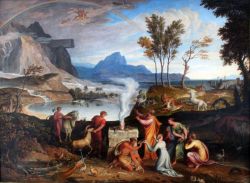 آنگاه نوح برای یهوه قربانگاهی ساخت و از همه حیوانات پاک و از همه پرندگان پاک به قربانگاه پیشکش کرد. زمانی که خدا بوی خوش را استشمام کرد، در قلب خود گفت: «دیگر هرگز زمین را به خاطر انسانها نفرین نخواهم کرد و هرگز موجودات زنده را آنگونه که نابود کردم، از بین نخواهم برد.» او نوح و پسرانش را برکت داد و به ایشان گفت ترسِ شما را در همه حیوانات قرار دادم و همه موجودات زنده غذای شما خواهند بود، فقط آنها را وقتی خون در رگهایشان است مخورید. همچنین هر انسانی که خون انسان دیگری را بریزد، خون او نیز باید ریخته شود. سپس الوهیم با نوح و پسرانش عهد بست:[۱۷]