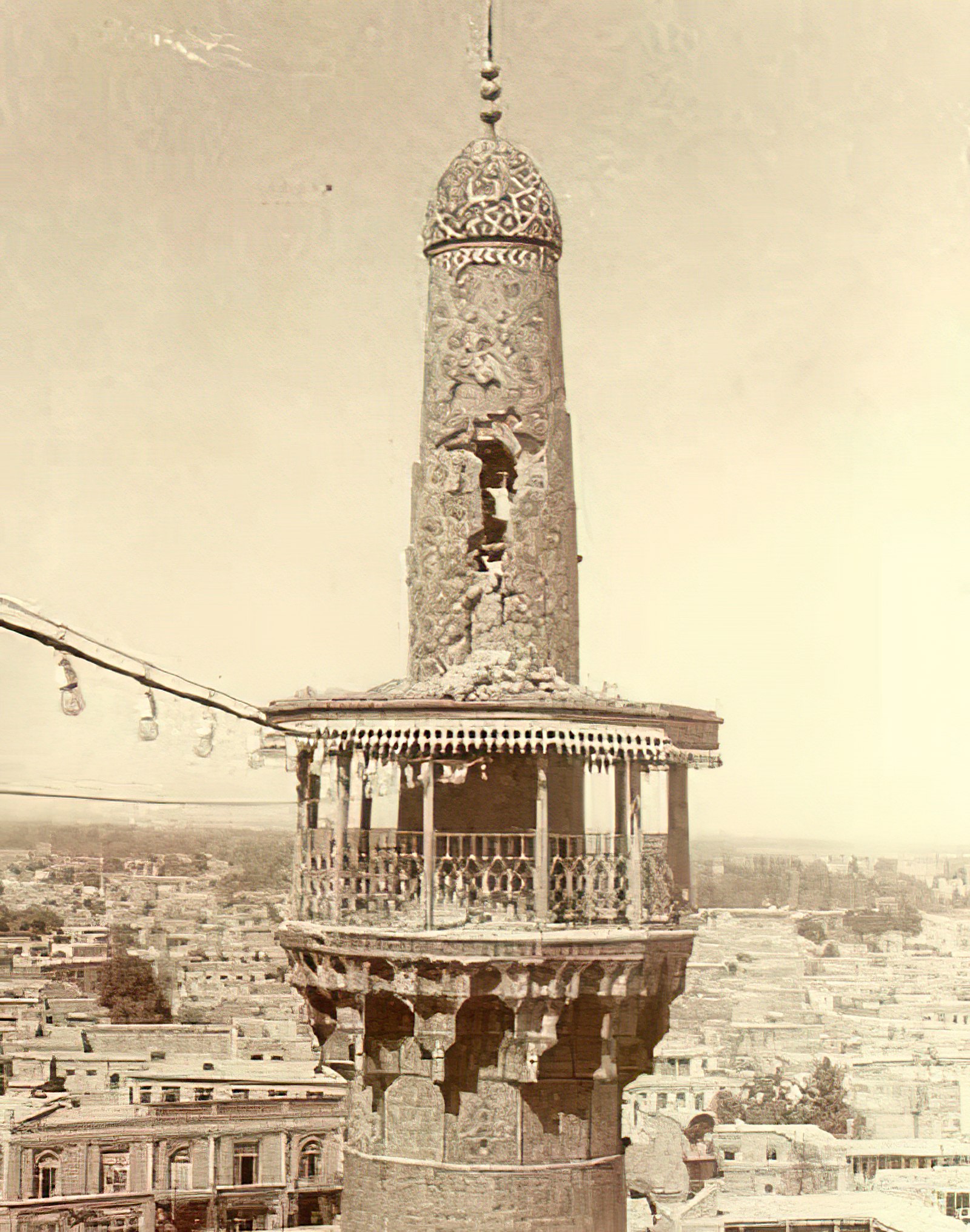 عکسی از گلدسته حرم امام رضا پس از اصابت گلوله توپ روسها