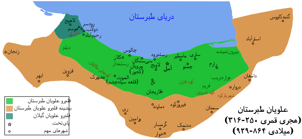 |[[علویان طبرستان]]||۸۶۴–۹۲۸||۲۵۰–۳۱۶ ه. ق||حسن بن زید علوی||[[آمل]]، [[ساری]] و [[استرآباد]]||[[پرونده: | |[[علویان طبرستان]]||۸۶۴–۹۲۸||۲۵۰–۳۱۶ ه. ق||حسن بن زید علوی||[[آمل]]، [[ساری]] و [[استرآباد]]||[[پرونده:Alavian-persian.svg]] | ||