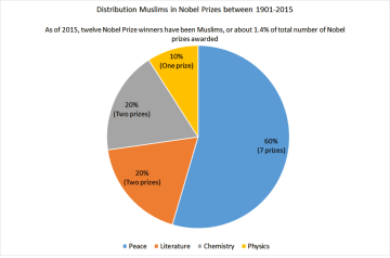مسلمانان در حدود ۲۳٪ از جمعیت جهان را تشکیل میدهند.[۸][۹][۱۰] تا سال ۲۰۱۵، از مجموع ۸۸۱ جایزه اعطا شده دوازده نفر (۱٫۳٪) از برندگان جوایز نوبل مسلمان بودهاند. هفت نفر (۰٫۸٪) جایزه صلح، دو نفر (۰٫۲٪) ادبیات و سه نفر (۰٫۳٪) در علوم پایه (فیزیک و شیمی) این جایزه را دریافت نمودهاند.[۱۱] اولین مسلمانی که موفق به کسب جایزه نوبل شد، انور سادات -رئیس جمهور وقت مصر- بود که توانست جایزه صلح نوبل را در سال ۱۹۷۸ کسب کند.[۱۲][۱۳] پس از او در سال ۱۹۷۹، محمد عبدالسلام توانست اولین جایزه علمی نوبل را از آن مسلمانان کند و جایزه نوبل در فیزیک را کسب کند.[۱۴][۱۵] آخرین جایزه نوبل که مسلمانان موفق به کسبش شدند، مربوط به سال ۲۰۱۵ است که طی آن، عزیز سنجر توانست جایزه شیمی نوبل را از آن خود کند. اولین زن برنده جایزه نوبل از میان مسلمانان، شیرین عبادی است که توانست در سال ۲۰۰۳ برنده جایزه صلح نوبل شود.[۱۶] ملاله یوسفزی دیگر زن مسلمان، با ۱۷ سال سن در هنگام دریافت جایزه، جوانترین فرد برنده جایزه نوبل محسوب میشود.[۱۷]